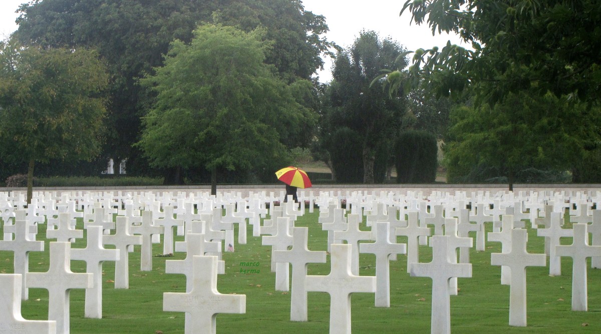 C’est une image totalement aberrante, rien de naturel. De naturel, oui, des arbres, certes beaux mais si étrangement plantés.. On y sent très fortement la « main de l’homme ». De l’herbe ? Oui, verte et homogène comme on en trouve parfois au bord de l’océan. Des croix blanches en une matière minérale, comme de la pierre marbreuse. Alignées et tellement nombreuses ! Qu’est-ce donc ? Dessus semblent écrits des mots.. Et au milieu une personne – une femme je pense – s’abritant d’un parapluie jaune et rouge, à moins que ce ne soit rouge et jaune. S’abritant de quoi ? De la pluie je suppose, d’une pluie fine, une pluie d’été, comme écrivait Marguerite Duras d’un peu plus à l’est en Normandie. Quel est le sens de tout cela ? Y en a-t-il seulement un ?