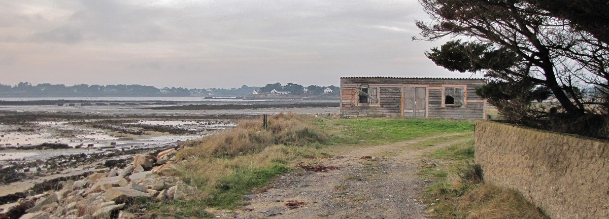 Cette cabane toute en bois, dans laquelle je crois était rangé des planches à voiles, du matériel de pêche et dans laquelle des gens passaient peut-être une partie de la belle saison, a été détruite il y a plusieurs années, construite sans doute sans aucune autorisation et au bord de la mer qui grignote beaucoup la côte à cet endroit. Ele se fondait pourtant assez bien dans le paysage, avec son bois grisant. Il n’en reste aujourd’hui qu’un bout de sol carrelé sur béton.