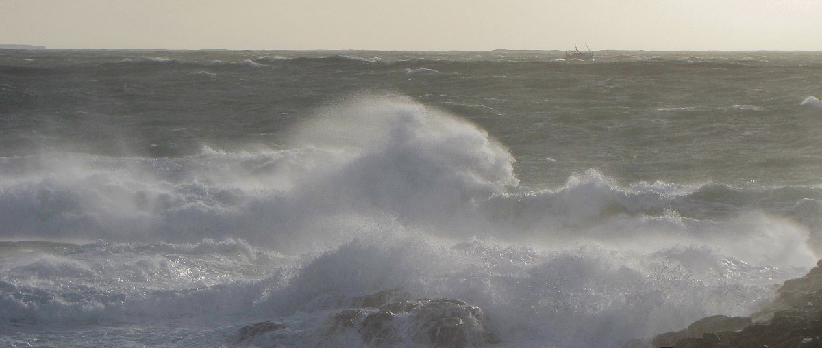 La « petite » tempête donne à plein, le vent souffle fort, difficile de maintenir l’appareil et même de tenir debout sans être bousculé, mais c’est tellement beau et impressionnant que l’on sort de l’auto à chaque occasion entre 2 grains pour voir, ressentir et capter quelques vagues magnifiques de puissance. Je suis concentré sur les vagues qui s’élèvent et lessivent la côte rocheuse quand, n’en croyant d’abord pas mes yeux, je m’aperçois qu’un chalutier est sorti de Quiberon et, montant et descendant, taille l’air de rien son bonhomme de chemin sur l’océan très agité. C’est ce qu’on appelle « une mer forte à très forte » et ce bateau d’une quinzaine de mètres semble une coquille de noix… Pourquoi diable sont-ils sortis ? Le doivent-ils vraiment ? La pêche est -elle bonne par ce temps ? Quelle qu’en soient les raisons, je trouve cela bien courageux, voire téméraire, en tous cas admirable (de lapin). Oups ! pardon, le mot à ne pas prononcer… Chapeau ! J’en ai discuté avec Jean-Claude, qui a été patron pêcheur de 1960 à 1992 (il a commencé comme mousse à 15 ans) qui m’a dit que quand il y a du vent et de la mer le poisson « soulage », c’est-à-dire qu’il est moins au fond, plus en surface ( ce qui veut dire la même chose) et que, de toute façon, c’est le métier, le travail, et qu’il faut bien y aller pour gagner, au pire, sa croûte, au mieux, de l’argent. En tous cas, c’est ce que j’ai compris.