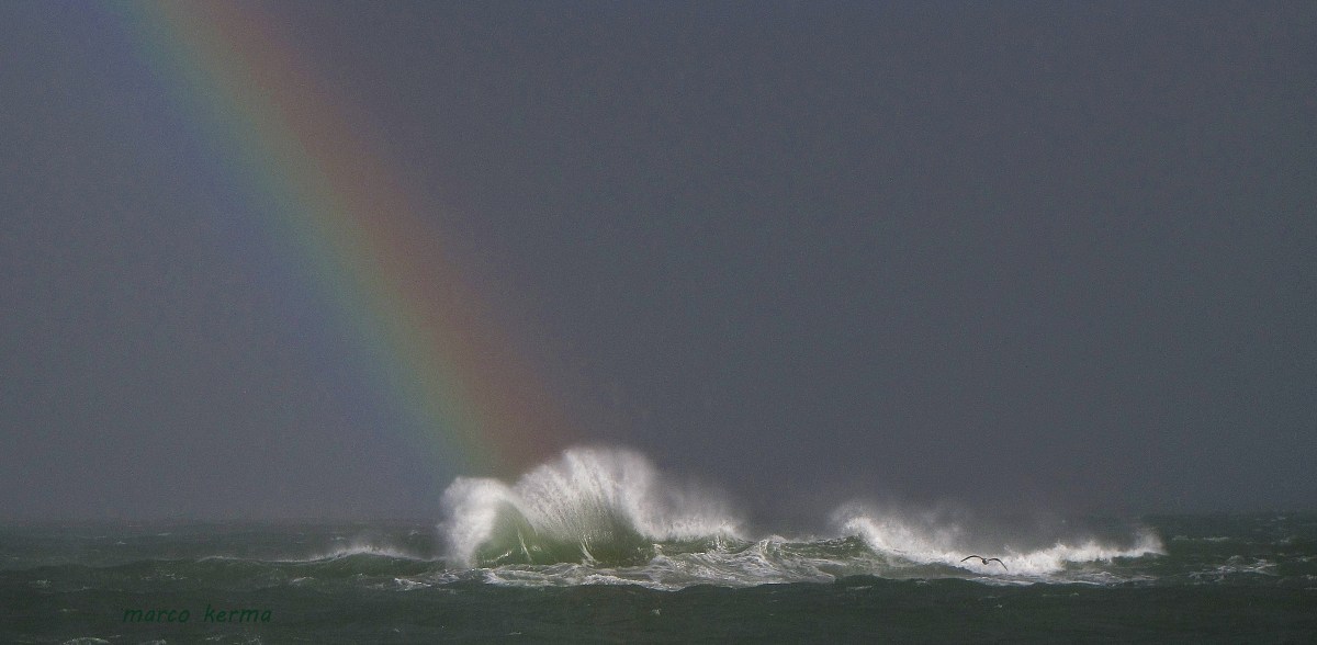 Nous étions parvenus à la pointe de la pointe de la presqu’île – le bout de la Pointe du Conguel – et j’étais occupé à photographier – enfin ! – ce phare de la Teignouse que je n’avais vu jusque-là que de très loin , tentant de m’abriter des grains, du vent et de la mer montante, lorsque apparut un, puis deux, arc-en-ciel sur la mer. Bien que n’aimant pas particulièrement les arcs-en-ciel (je ne sais pas pourquoi… je devrais aimer cette décomposition des couleurs mais je trouve l’effet trop simple, trop tapageur, trop « disco »..) j’ai fait quelques clichés, de trop loin, flous, sauf un, qui me donne l’impression que l’arc-en-ciel a frappé la mer et en a fait jaillir cette vague… Le fait en plus qu’un goéland se superpose exactement sur le blanc de l’écume est un sacré coup de chance !