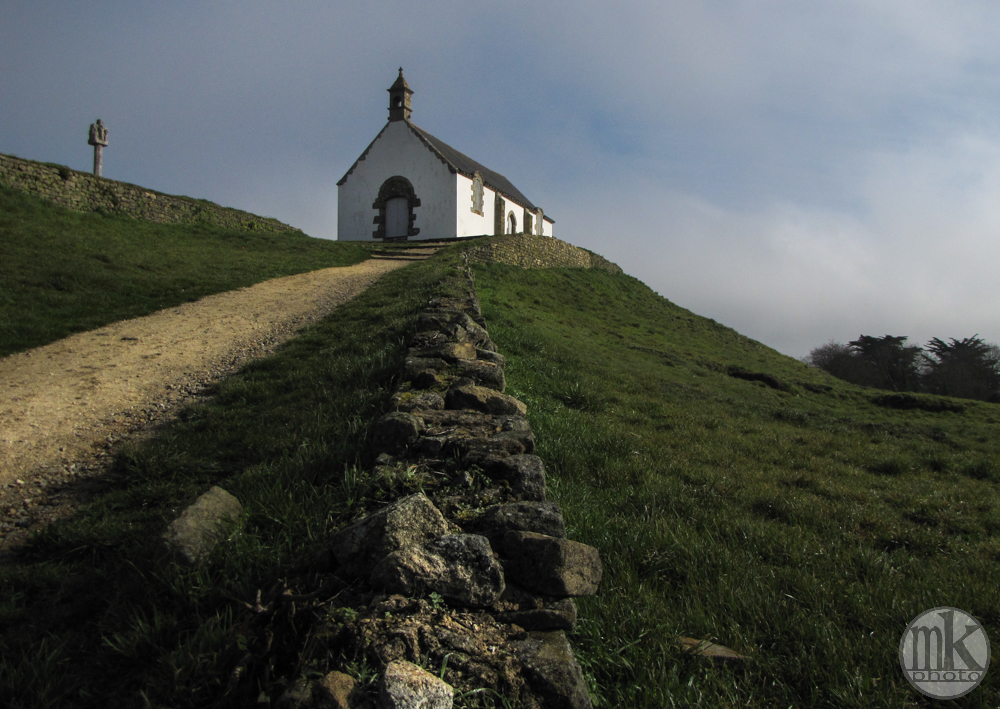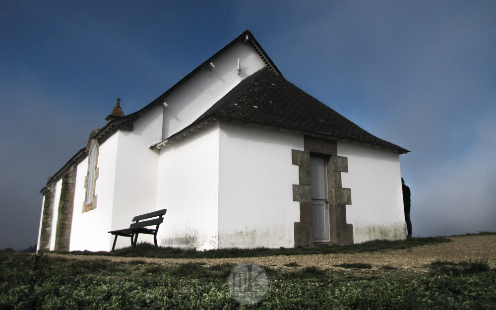 Chapelle construite en 1926/27 à la place d’une chapelle de 1663/64 (d’après Zacharie Rouzic, l’archéologue qui a fouillé le site de 1900 à 1907), détruite en 1796 et qui avait elle-même remplacé une chapelle du VIè s, elle-même construite sur ce tertre , ce tumulus élevé probablement 50 siècles av.JC .. Donc on peut dire que de là-haut 70 siècles nous contemplent.. Sa couleur blanche en fait (faisait) un amer pour les bateaux (mais eau début du XXiè siècle les pierres n’étaient pas recouvertes de cet enduit).