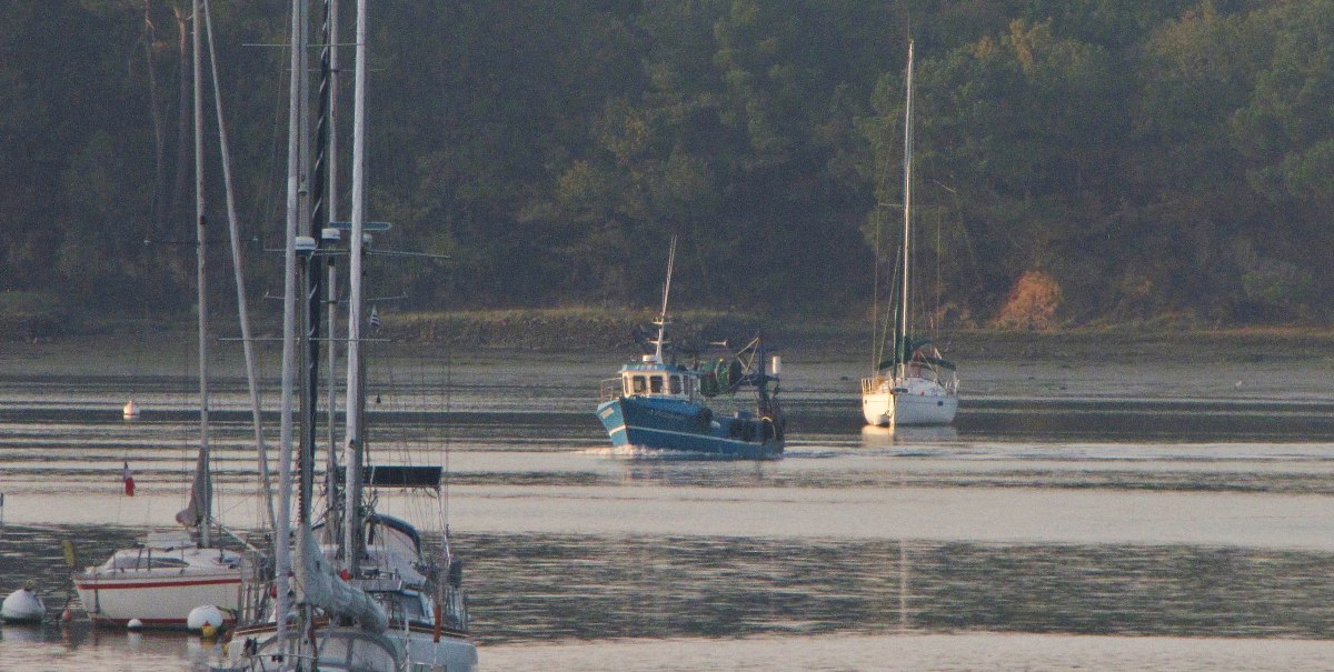 A Mané Verh, le chenal de la rivière fait une centaine de mètres de large, des bateaux y sont au corps mort.. On peut donc photographier d’assez près, de la berge, les embarcations passant, comme le Jema, apparemment le dernier bateau de pêche du Bono.