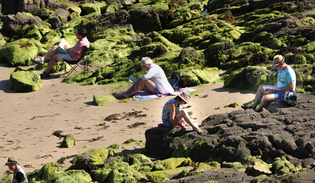 » ça bosse en vacances ! » Toute petite crique de Barbe Brûlée. Surprise de voir qu’il y a un escalier très pentu qui mène à quelques mètres carrés de sable et de n’y découvrir, presque, que des personnes qui y lisent. Livres, manuscrits, études, thèses, ébauches d’articles, recueils de sudoku… ? L’impression que sont concentrées là des personnes qui travaillent. Qui travaillent dans des maisons d’édition, des revues littéraires, des « grands » journaux. On est juste avant la « rentrée littéraire ». Peut-être des lecteurs professionnels, « de Paris », qui bossent en s’accordant, les textes plein leur cerveau, un dernier et urgent rayon de soleil au bord de la mer.. Reprendront-ils à St Malo un train ce soir pour Paris ?