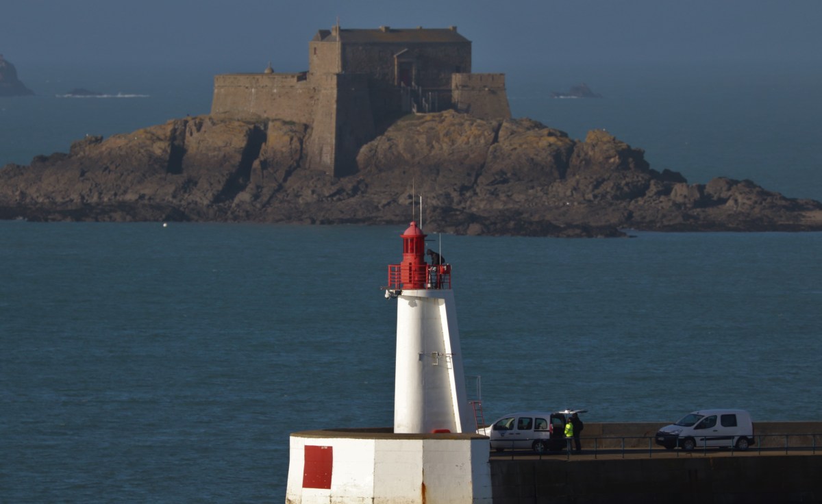 Au fond le fort de la Conchée. Au-delà du feu du môle des Noires, l’île du Grand Bé sur laquelle se trouve le tombeau de René de Chateaubriand.