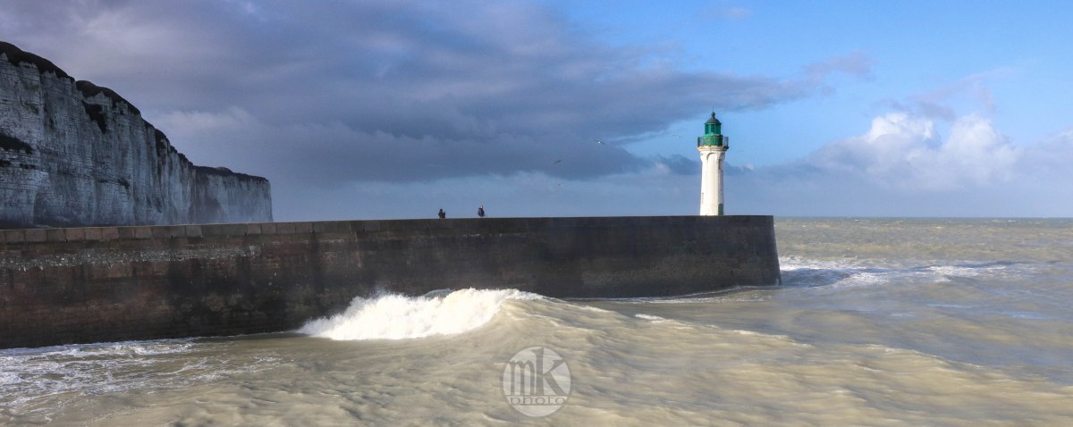 Quelle belle idée aussi de ne planter aucun lampadaire sur la jetée, rien qui ne vienne interrompre sa longue horizontalité hormis la chandelle du phare planté au bout comme un but de promenade.. Verticalité des falaises gris-blanc, du phare, horizontalité de la jetée, ondulations liquides et mouvantes de l’eau verdâtre crêtée du blanc des écumes au soleil.. La beauté nait ici de complémentarités minimales..