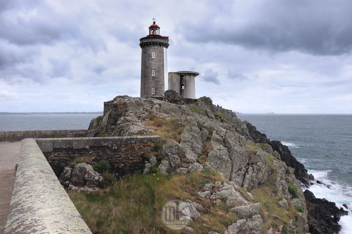 Cette double courbe de la structure pierrée qui y mène apporte un élément intéressant complétant l’esthétique rectiligne du phare. Au loin, la pointe du Toulinguet, son phare et son sémaphore et le Rocher du Lion.
