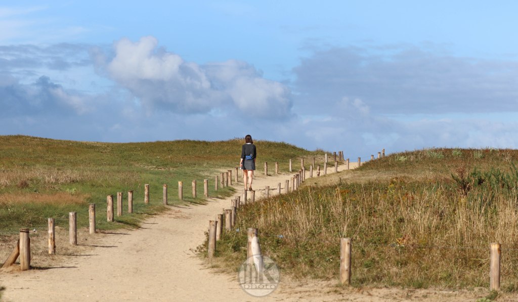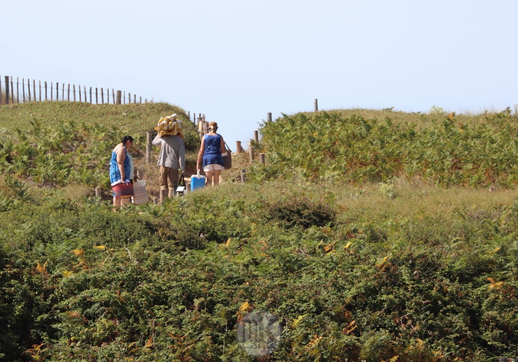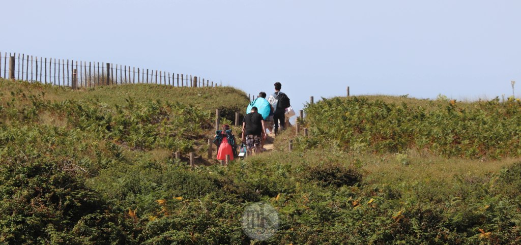 On y presque. Il est déjà tard dans la matinée : le soleil commence à taper et certains en reviennent déjà.Quand on n’y va pas sans rien, les mains dans les poches, la plage ça se mérite. Il faut gravir l’ultime dune, chargé de tout ce qu’on a décidé d’emporter pour y passer toute l’après-midi..Les derniers mètres sont les plus durs : on fait une pause mais, après tout, l’ascension n’a pris qu’1 minute, une minute pour se réjouir de La revoir. Ce moment – dans l’enfance déjà – qui précède juste la redécouverte de la mer est fait d’interrogations : « comment ce sera aujourd’hui ? A quoi ressemblera-t-elle ? Comment seront les couleurs, la lumière ? Y aura-t-il quelque chose de nouveau ? Et, vers 12 ans.. le cœur battant.. « Sera-t-Elle là ? »