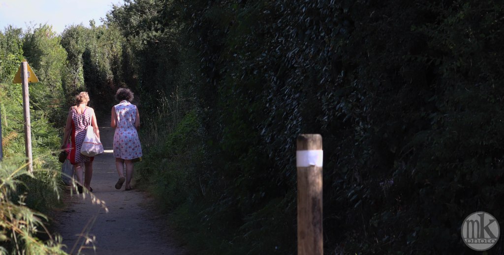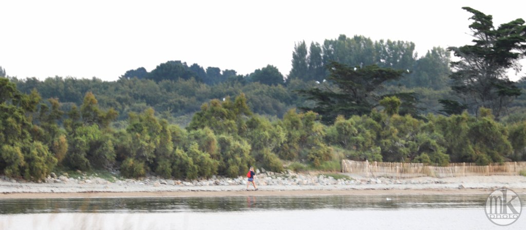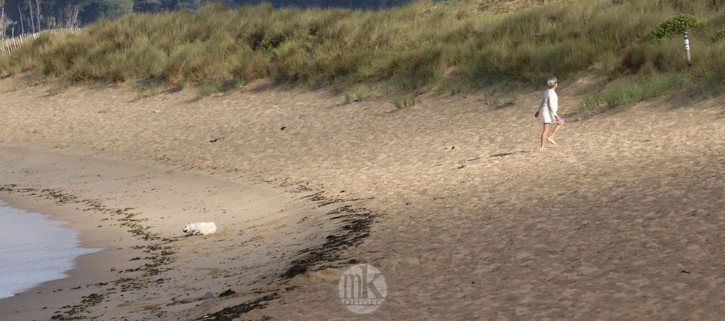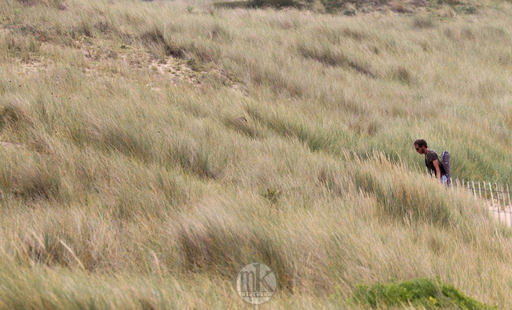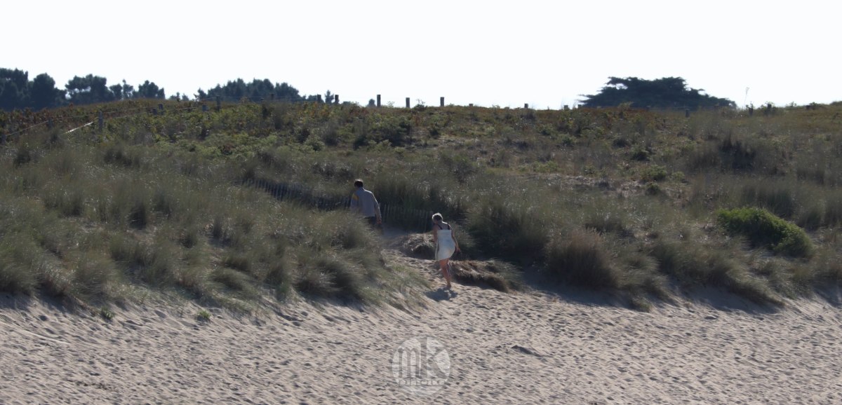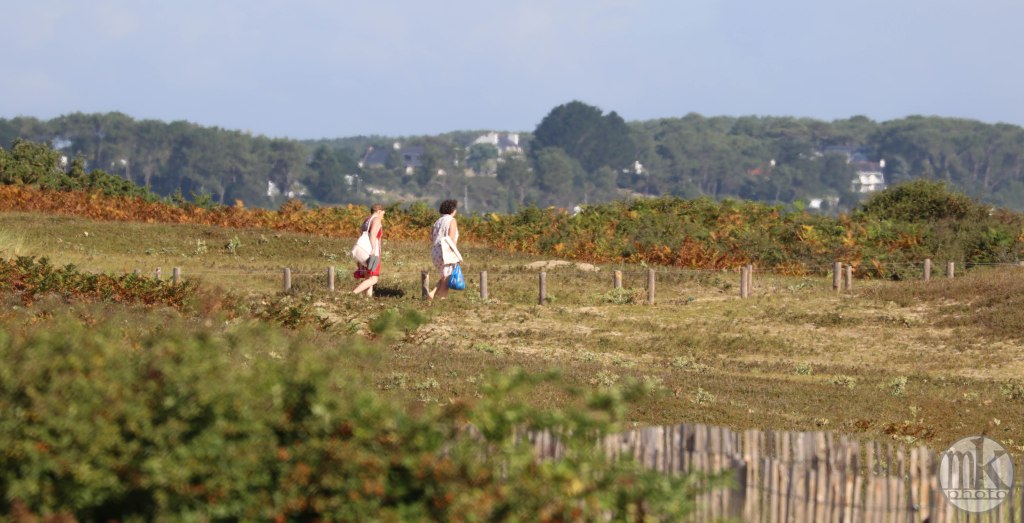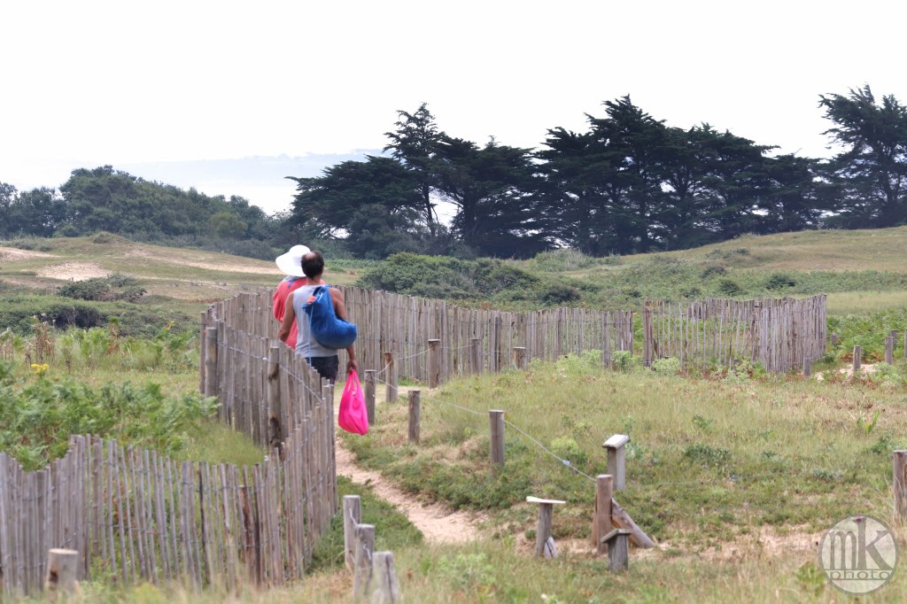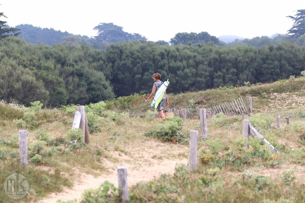 .. en plus il faut remonter la pente qui, à l’aller, nous avait fait courir vers la mer.. Je sais que j’avais cette sensation, cette émotion et ce sentiment dans mon enfance : on allait « à la Grande plage », et non « dans la Baie », juste devant le champ où on campait, de l’autre côté de cette dune. On marchait vers la dune : une colline. On grimpait. C’était un peu difficile mais on était légers et nos petits muscles étaient efficaces pour ce qu’on avait à faire. On arrivait en haut et ce n’était alors pas une émotion visuelle mais physique car tout de suite je dévalais la pente les pieds nus dans le sable si vite que je ne contrôlais plus trop et on atterrissait en un grand saut qui nous plantait jusqu’au haut de nos tibias minces les jambes dans le sable chaud. Il est possible qu’un cri d’exaltation était poussé vers la fin de cette cavalcade. Depuis, ce chemin de sable existant toujours, c’est celui que de préférence j’emprunte, avec parcimonie, de crainte que de réveiller ce souvenir si vivant en moi ne le sorte dangereusement de la gangue peut-être mythifiée des étés de mon enfance et ne fasse battre mon cœur trop vite.