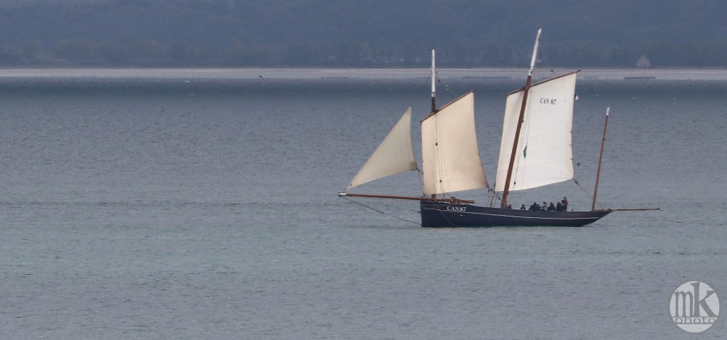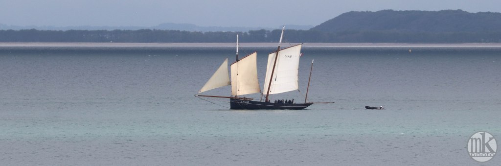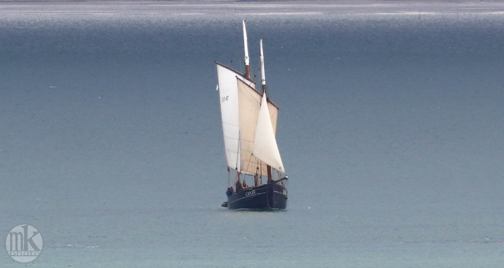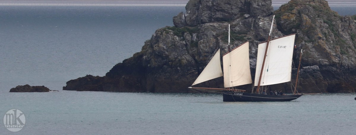 Même si la bisquine n’a pas hissé ses 3 étages de voiles ( réservés aux parades et régates), c’est un bonheur de la voir ainsi sur les lieux où elle a été construite en 1987 et où tant d’autres bisquines ( des dizaines, selon des photos autour de 1900) ont dragué les coquilles St Jacques et les huîtres pendant des décennies.
