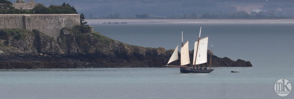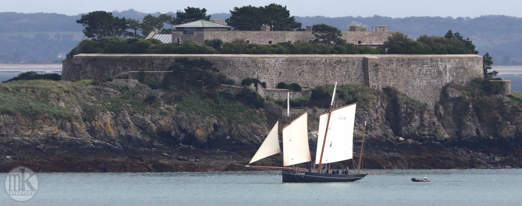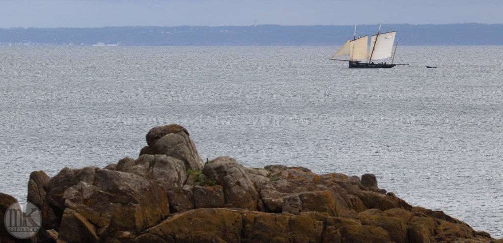 Après sa pause déjeuner au port de la Houle la Cancalaise a appareillé. Vue du sentier côtier elle semble poser près des lieux emblématiques du coin : l’île des Rimains, l’île le Châtellier et le fameux Rocher de Cancale, de surfaces modestes mais culminant à près de 40 m, ce qui en fait un décor spectaculaire et photogénique.