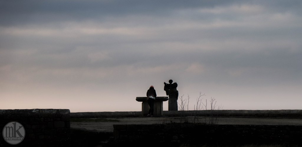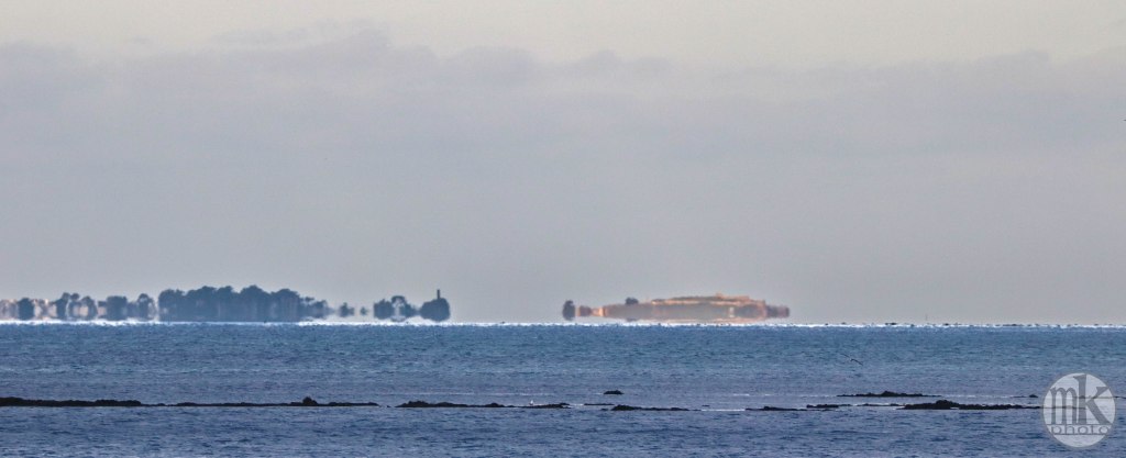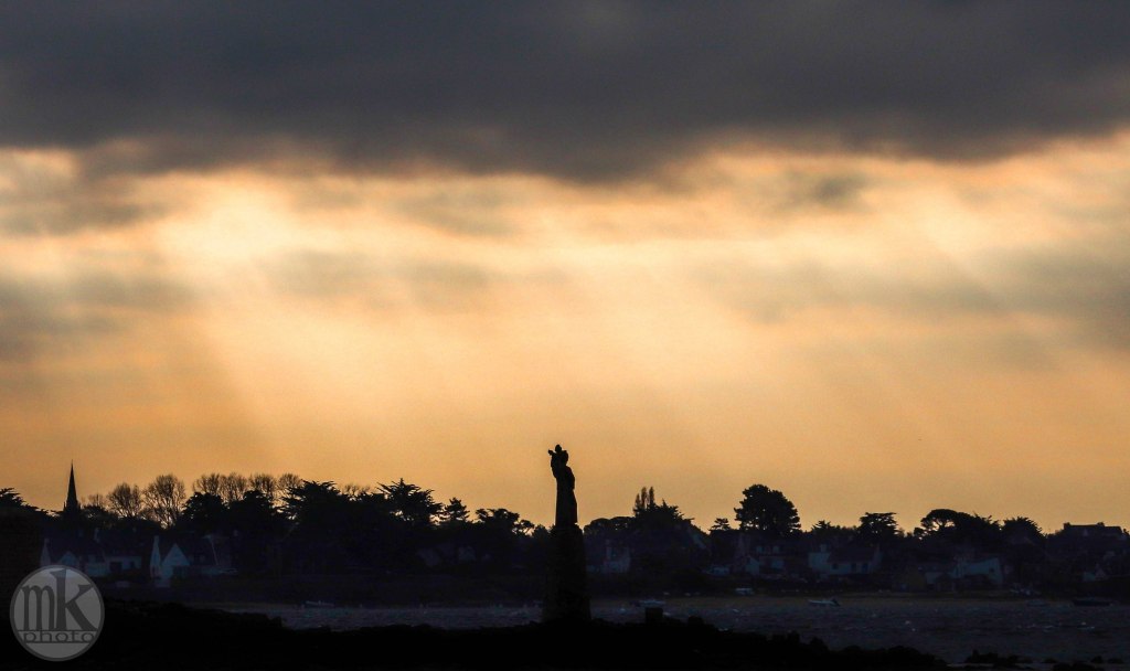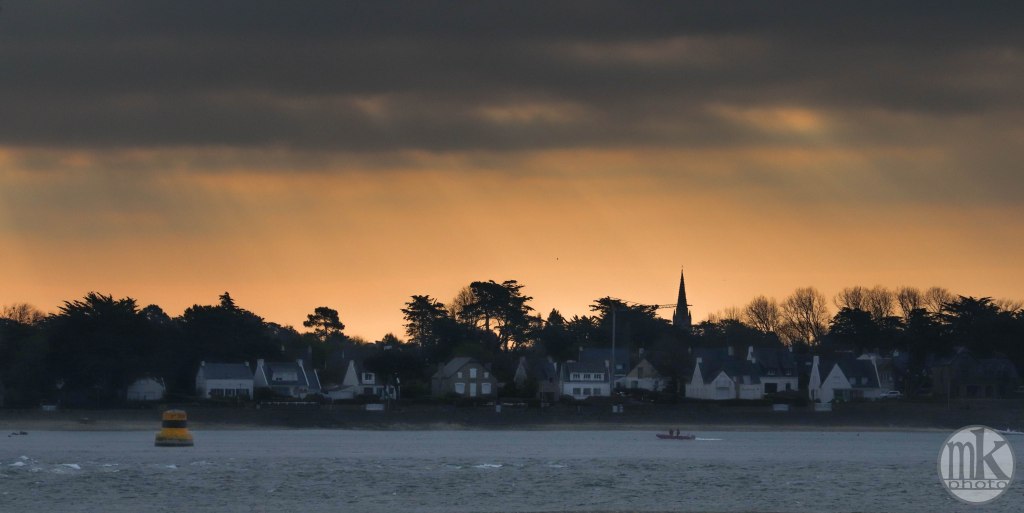 Méaban, depuis le Pointe de Kerpenhir, 7h26. A la pointe le vent passe plus vif. Jusque-là j’étais presque seul.Une jeune femme est apparue sur la plage de l’école de voile. De loin sa démarche et ses gestes me semblaient montrer qu’elle était en forme, heureuse d’être là. Je continuai à vaquer à mes attentions de photographe. Je sentis bientôt une présence derrière moi. J’avais bien vu qu’elle semblait avoir pris le sentier que je venais d’emprunter mais je fus quand même surpris quand je l’entendis juste derrière moi. 2 regards, 2 bonjours, 2 sourires, le tout en 2 secondes, puis un bref échange sur le caractère vivifiant de l’air. Elle veut me rassurer sur l’éventualité de l’arrivée du soleil. Elle ne sait pas que je ne suis pas inquiet et que j’apprécie les nuages et ne suis pas dérangé par le froid. Elle continue son tour de marche et s’arrête un peu à la table d’orientation sur le belvédère (un peu après je verrai qu’un pêcheur très matinal, trentenaire et bavard lui a semble-t-il tenu la jambe un peu plus loin).Penthièvre, 7h34. L’air vif, qui sait, est peut-être responsable de la réfection des formes à l’horizon de la presqu’île, qu’on nomme « fata morgana », histoire de créer par des mots un peu d’imaginaire..Décidément les lieux ont en ce début de jour un air dramatique, hugolien, presque inquiétant. Est-ce l’âme du cyprès le plus proche du belvédère (cf ma photo « les amoureux à la pointe ») déchiré en 2 par une des tempêtes de février, puis tronçonné entièrement (alors qu’un cyprès mutilé a une silhouette intéressante) , qui rend les lieux chagrins, lugubres et comme en deuil ?Des Tourne-pierre (7h54), ignorant de tout cela surgissent de l’eau sur un rocher. Ils semblent toujours chiffonnés, fatigués, avec leurs plumages de tâches et leur air renfrogné. Sont-ils juste fatigués, voire épuisés, d’avoir volé si vite, si vivement avec tant de virtuosité au-dessus des eaux ?Notre-Dame de Kerdro, 7h58. La statue de « Notre-Dame-de-Kerdro », représentant une femme – la Vierge – tenant un petit enfant – « l’enfant-Jésus » – qui a l’air réjoui, sur son bras gauche, le brandissant devant la mer, apporte tout de même une touche esthétiquement intéressante de silhouette presque immuable dans ce décor hérissé d’arbres, de maisons et d’un clocher (c’est mieux que les antennes-relais et les grues que je m’efforce de ne pas montrer..)Venant sans doute de Vannes, la vedette Kerpenhir, double l’île de Berder, de Gavrinis et dans un instant l’île Longue en remontant le courant de la Jument, à cette heure indécis (la « renverse »), entre deux eaux, mais encore puissant. Il y a très peu de passagers à bord mais le service est le service. Il accostera au Port-Navalo, histoire de prendre, en ces temps entre 2 saisons covidées, 2 ou 3 passagers et de reprendre son souffle avant de filer vent de travers et courant devant vers Houat.