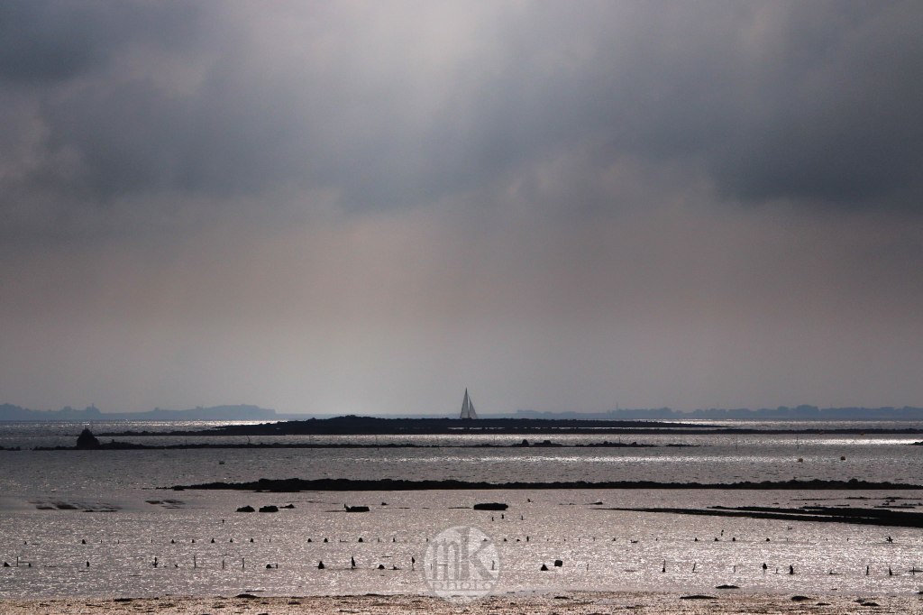 Mais pour ce jour je vous propose une première vue qui me plait, malgré qu’elle ait été faite depuis un lieux d’où j’ai déjà poser mes yeux. Les sables y étaient roses saumon, la mer métallique, le ciel un tantinet wagnérien, hollywoodien (qualifiez-le avec vos mots). Le rocher de Men er Beleg (ou « la pierre du Curé – du prêtre », ou, selon l’auto-proclamé « gardien des parcs », « le rocher des Naufragés » ou, selon une carte officielle, « le Grand Pelligo »..) y est bien à gauche et le voilier rentrant à la Trinité s/Mer est bien présent et cela fait une image qui plait à mon regard..